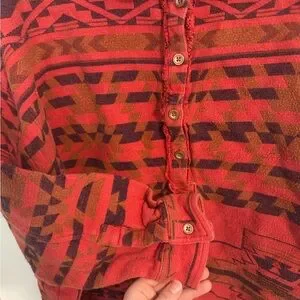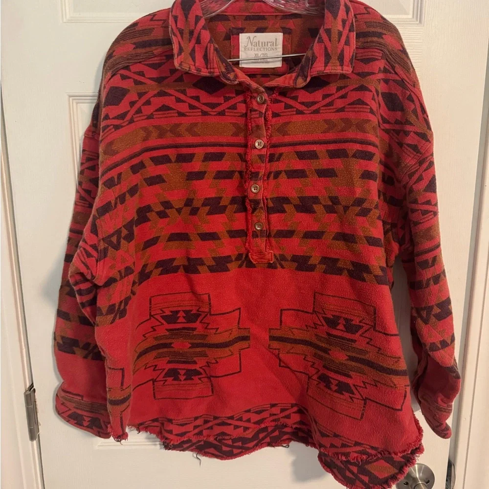 Stylish pullover with a vibrant red and brown pattern. Features a button-up front and collar.