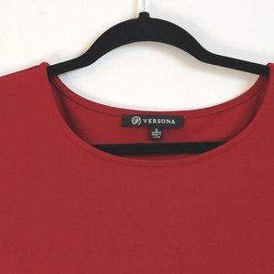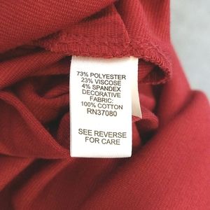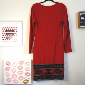 Brick red fall/winter dress has an Aztec hemline. 25 inch sleeves. Bust line darts, neatly trimmed collar and soft to touch. Works great to be worn for the office. Throw on with some tights to make a standout statement