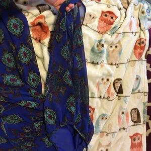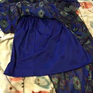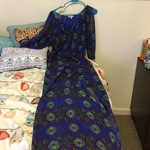 A cute maxi dress that has slits on both sides but only to mid thigh. There is a blue covering underneath and the sleeves are slit open from the shoulder to the elbow. Super cute for summer time!