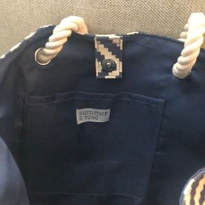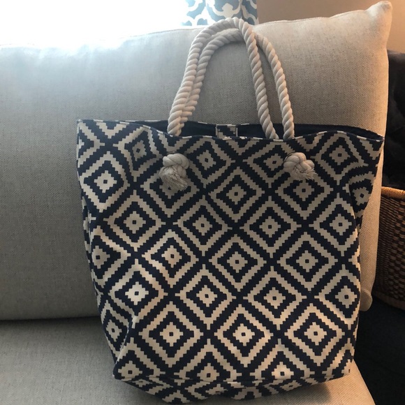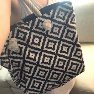 Never used. Magnetic clasp, white rope handles and pretty Aztec diamond pattern. Perfect for a laptop/work bag!