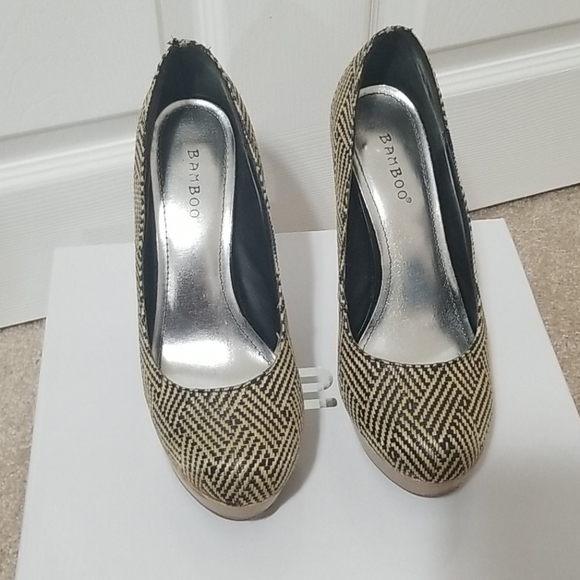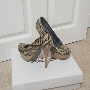 Black and tan Aztec print heels. Heel 6", platform 2"