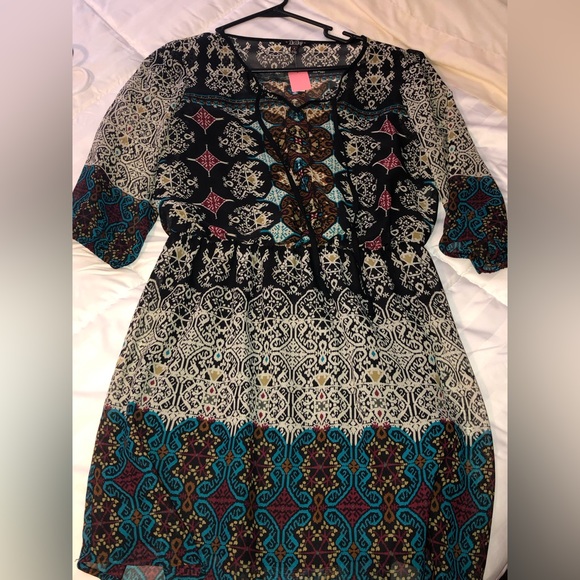 3/4 sleeve Cinched waist flowy Aztec pattern mini dress Size M