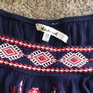 Navy blue top with off the shoulder details. The tag is separated from the shirt on one side from going through washing machine. The shirt is supposed to be worn a little wrinkly to give it more of a boho vibe.