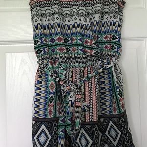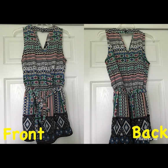 Super cute and fun shorts romper! Fun Aztec pattern. Has tie belt and layered front (have the option to be more modest with the discreet button on it or more revealing by not using it). One button on back of neck as well. Not extremely stretchy but does have a small amount of give. Great condition, worn only once! (JUNIORS )