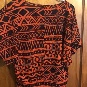Orange and black flowy-sleeved top. Tightens a little at bottom. No size available, fits like medium