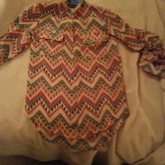 It is a loose fitting sheer three quarter length shirt with a collar that is kind of a zigzag with orange red browns and blues