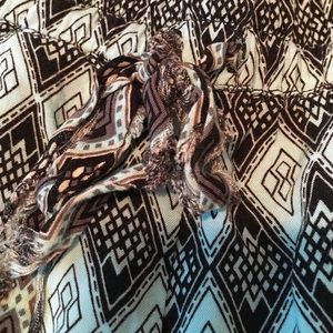 Aztec print shorts. Cloth material. Flowy and really comfortable. The string is a little torn but still works perfectly fine.