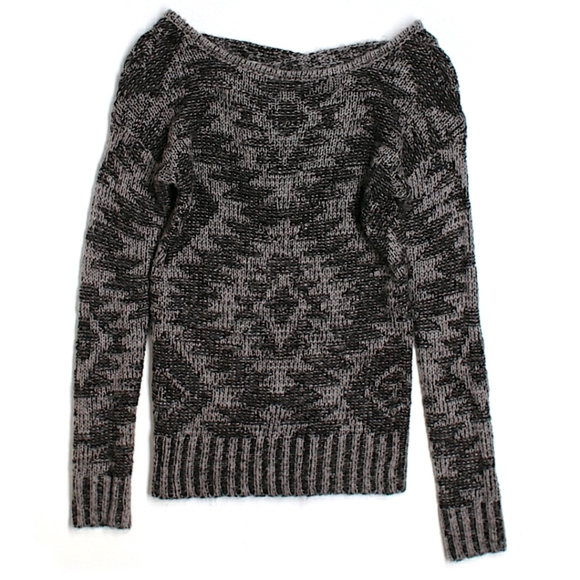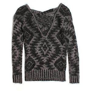 Gray and black Aztec patterned sweater with criss cross cut out detail at the top of the back
