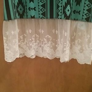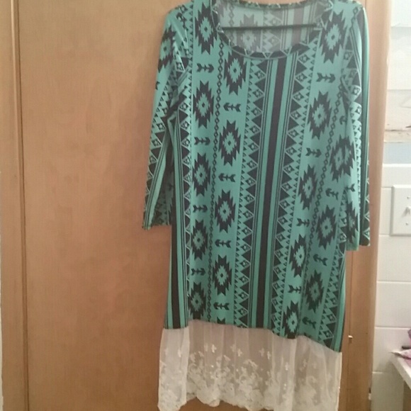 Super cute longer more tunic type top. Turquoise and black with cute white lace on bottom. Only worn twice excellent condition