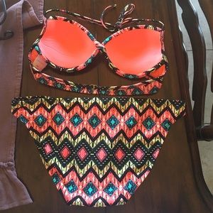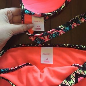 very bright and fun(: bottoms are a large and too is a medium with a slight push up