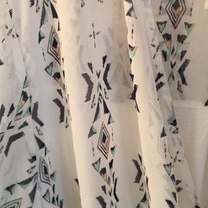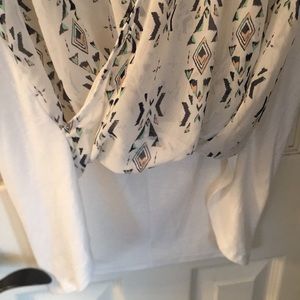 Super cute wrap detail top with subtle Aztec print. Colors are teal blush and navy on an ivory background. Supersoft. Needs a Cami or tank top worn underneath