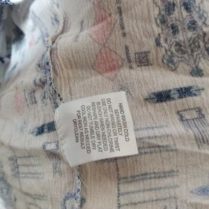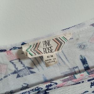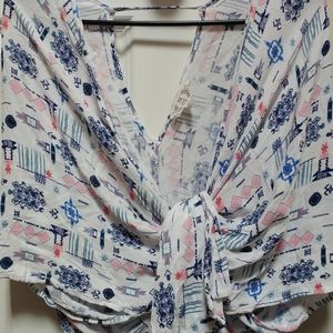 Thin medium Pink Rose wrap top. Blue, pink, & white open back with the option to tie in the front or hang loose:) Great shape looking for a new home! All offers are welcome and encouraged.