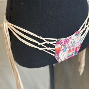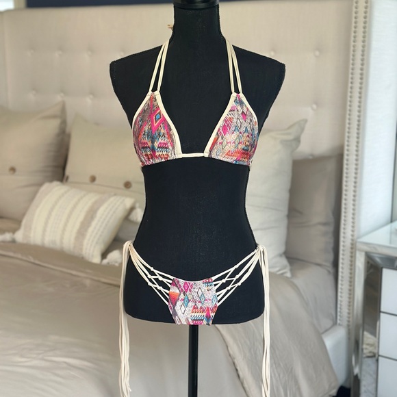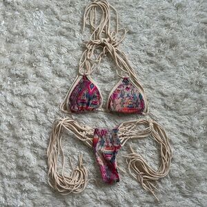 Stand out at the beach with this Aztec print bikini set. Featuring a mix of pink and cream colors, this swimwear is perfect for making a statement. Enjoy comfort and style with this eye-catching design. Material is very stretchy. Size small with little coverage. Brazilian-inspired style.
