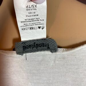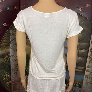 Tee is heathered white with an Aztec Print in turquoise, dark red and black. Vee with tie and tassel at neckline. Size is XS