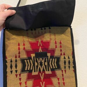 Flap Top with velcro closure and fully lined interior with inside zippered pocket. Woven acrylic with cotton handle. Imported. Apx. 12" x 12" x 1"; 15" strap drop. If you love-free people, Johnny Was, Spell & the Gypsy, Pendleton, Anthropolgy Bohemian gift date night girls night wedding birthday hippie flower child surfer girl wild child trendy western cowgirl oversized western festival
