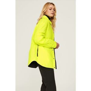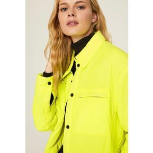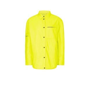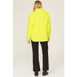 Yellow neoprene (100% Nylon). Lining (100% Nylon with 100% Polyester fill). Shirt Jacket. Long sleeves. Collar. Front button closure. 29" from shoulder to hemline.