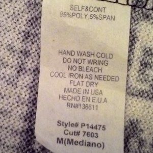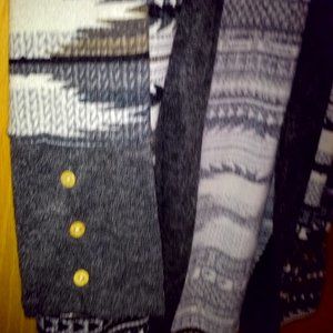 Women's cardigan in Dark & light grays, brown, black & cream Aztec print. Three decorative wood look buttons on each cuff. This is a lightweight knit type material. It is 33" long from the base of the neck to the hemline in back. Size Medium. Lightly used condition.