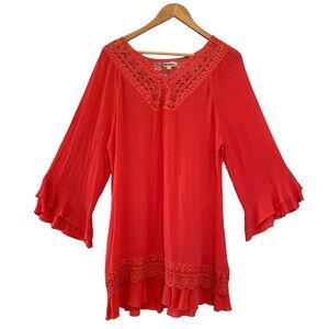 Tunic: Ruffle Bell Sleeves, Lace Embroidered Neckline, Tiered Ruffle Hem