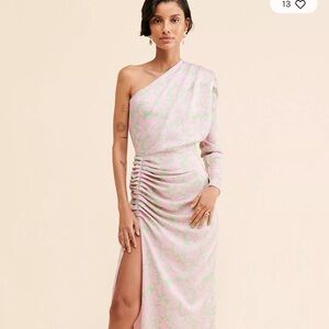 One-shoulder lilac dress with pearl and gold detail buttons and slit. Picture on the model is a different pattern to show the fit! New with tags.