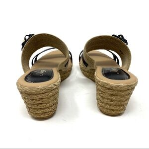 European inspired design, leather and canvas elastic upper, cork inspired textured wedge.