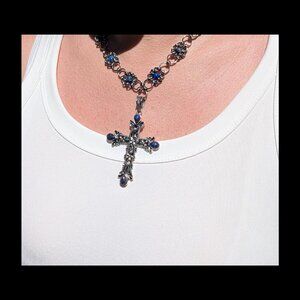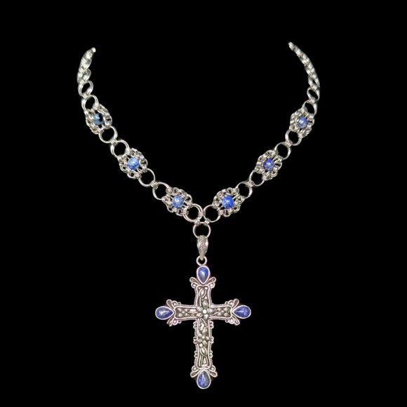 A striking handmade chain necklace featuring an intricately designed Lapis Lazuli cross pendant.
