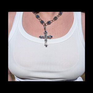 The vibrant blue stones in the cross and throughout the chain reflect a sense of timeless grace and power.