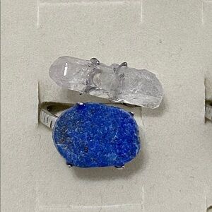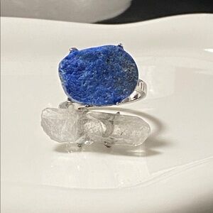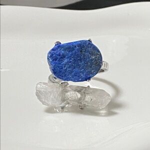 Beautiful dual‑stone statement ring featuring a raw Azurite crystal paired with a natural Clear Quartz point. The azurite displays a rich, deep blue tone with earthy texture, while the quartz adds brightness and clarity. Set on a silver‑tone adjustable band, this open‑style design creates a bold, high‑energy piece perfect for collectors and crystal lovers.