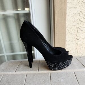 B. Brian Atwood 'Bea' Crystal-Coated black Suede Platform Peep toe Pumps in a size 9 1/2 US. Anthracite crystals create steely edge on the platform and heel of a lofty peep-toe pump.