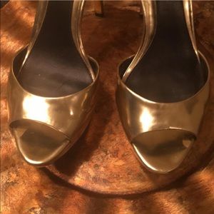 Leather lining and sole. 3 1/2″ equivalent. Adjustable buckled ankle strap. Mirrored metallic leather. 4 1/2″ covered heel, 1″ beveled island platform.