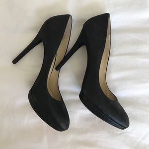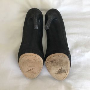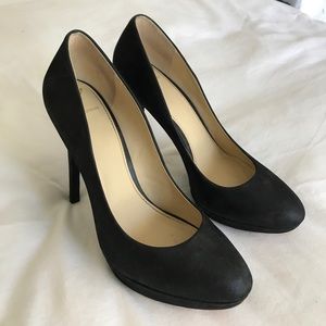 Like new. Worn only 4 times. A chic, classically shaped pump with a slim wrapped heel and diminutive platform is styled in soft suede. 4 1/4" heel with 1/2" platform in black nubuck.