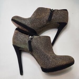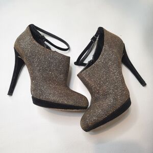 B Brian Atwood women's booties in a sparkly fabric that looks silver or a bit gold depending on how the light is reflected. Size 6.5.