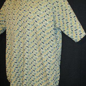 Available for sale is the B D Baggies multicolored (pale green, navy blue, yellowish brown) shirt. This floral bats shirt has a button down design with short sleeves. The rear hem is two inches longer. A button is missing from the placket, (as pointed out on one of the pictures), and it has a chest pocket.