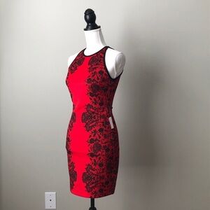 Beautiful red and black faux floral lace print. Sleeveless body con style. Exposed zipper in the back.