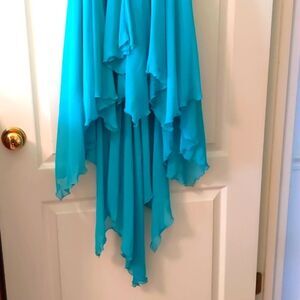 school dance green black formal dressy long floor length tiered layered glam ball red carpet flowing flowy draped aqua turquoise