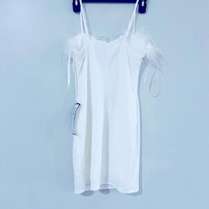 Pretty feathers add a fun touch to the neckline of this sleek bodycon minidress from B Darlin.