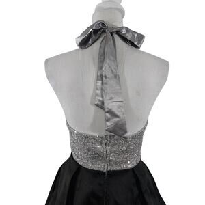 B. DARLIN! LUXE BLACK SATIN & SILVER SEQUINNED HALTER TIE BODICE DRESS! SZ 5/6