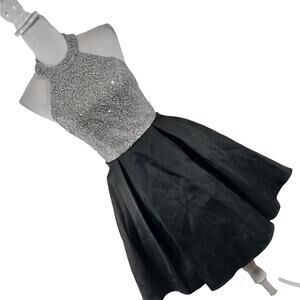 What a terrifically beautiful dress from B. Darlin! With a skirt of black satin, and poufed in place by a hidden demi-petticoat, it features a silver satin halter top with silver embroidery and sequins! Tied at the neck by a silver/,gray ribbon! Back zipper, Size 5/6, incredibly delicious! Worn once! Excellent! Superb EUC Condition! **ABSOLUTELY GUARANTEED CONDITION: EUC MINTY-EXCELLENT TO LIKE-NEW, by Lily @HauteClub!***