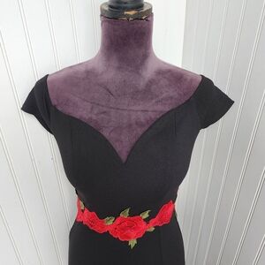 B. Darlin Black Formal Dress Red Rose Detail Off Shoulder Sleeves Maxi Sz 3/4
