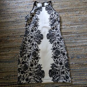 Chic and flattering halter-style bodycon dress by B. Darlin featuring an elegant black lace overlay print on a crisp ivory white background. Sleeveless design with black trim at the neckline and a full zip closure at the back. The placement of the lace creates an hourglass illusion that enhances your shape. Measures approximately 17” across the bust and 33” shoulder to hem. Estimated to fit like a women’s medium. Ideal for cocktail hour, parties, or a polished night out.