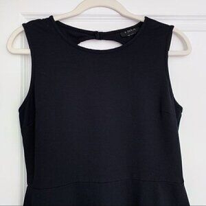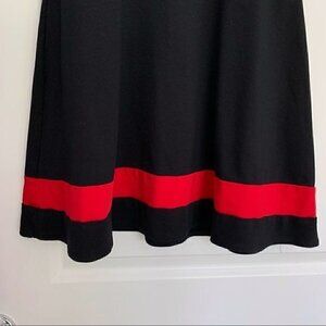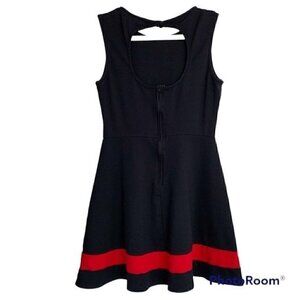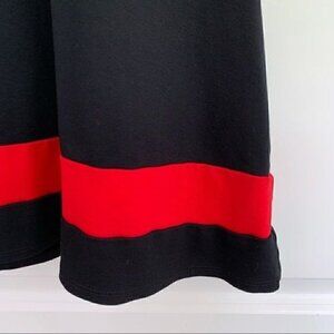 Mini dress, black fabric with red stripe on the skirt. Zipper and button closure in the back. I cut off the size tag but if I remember correctly the size is junior large. Excellent condition, probably never worn, washed. 32” length, 13” waist diameter but the fabric is stretchy so there may be extra room.