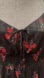 Elegant black dress with vibrant red floral pattern. Features a smocked waist and tie-front detail. Perfect for any occasion.