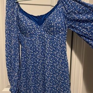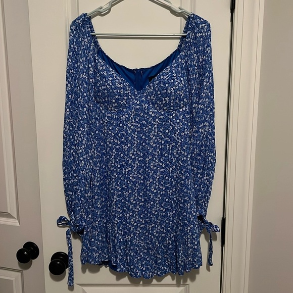 Charming blue floral dress. Long sleeves with tie details. Perfect for casual outings.