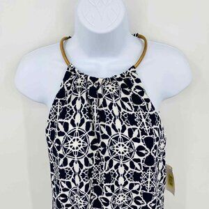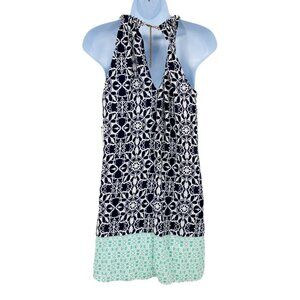 B. Darlin Dress Womens 5/6 Navy Blue Aqua Gold Coil Neckline Geometric NEW