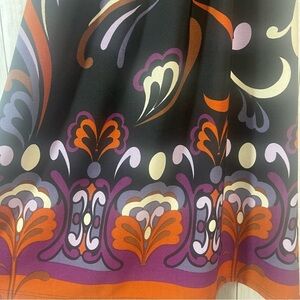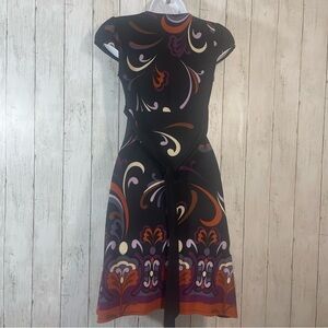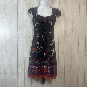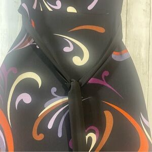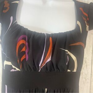 Black with multicolored pattern, cap sleeves, ties in back, minor snag flaw on back, colors may vary due to lighting, good used condition, Size 3/4