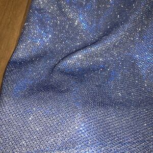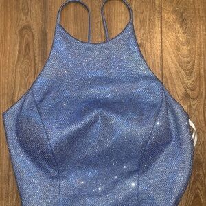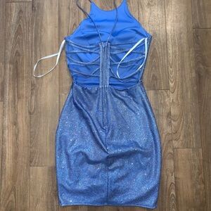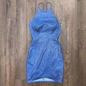 Shimmer all night in this gorgeous B. Darlin dress made in a glitter iridescent knit. This slim fitting dress features a halter neck, open back crisscross to reveal a sexy back. The body conscious short skirt hits about mid thigh. Dress also comes with a built in bra.