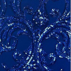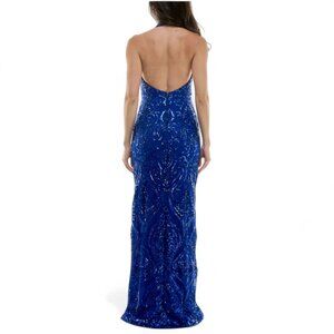 B Darlin, formal dress, gown, prom dress, special occasion, homecoming, wedding guest dress, bridesmaid dress, cocktail party, New Year's Eve, holiday party, gala, black-tie event, red carpet, charity ball, military ball, formal dinner, school dance, formal dance, pageant, quinceañera, sequined, beaded, embellished, glitter, sparkle, halter neck, v-neck, open back, backless, high slit, side slit, electric blue, royal blue, cobalt blue, mermaid silhouette, bodycon, juniors, designer, size 13 dress, size 14 dress, size 13/14 dress, prom gown large