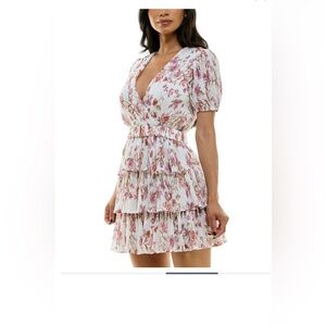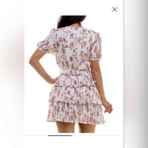 Embrace elegance with this floral tiered dress. Perfect for any occasion, it features a beautiful pink floral pattern on a white background. The dress offers a flattering fit with its tiered design. Approx. 35" long from center back neck to hem. Length is based on size 7/8