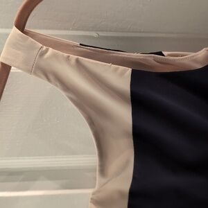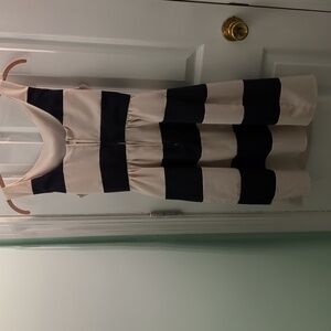 Chic sleeveless midi dress with bold navy blue and cream stripes. Perfect for versatile styling.