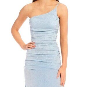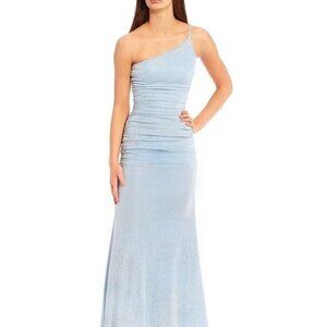 B. Darlin One-Shoulder Side Shirred Long Gown DRESS Periwinkle/Silver blue 1/2