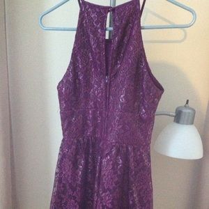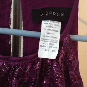 This is a junior size 5/6 dress purchased at Macy's, worn only once. It is above-the knee length (cropping issue when posted), with a zipper up the back, a peephole area and a button closure at the neck. It is not as dark of a purple as it seems in the color photo, closer to photo of the back. The lace overlay is thread through with an almost metallic/shiny quality.